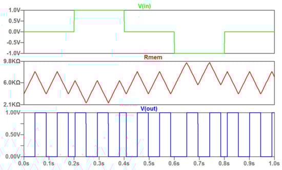 The change in the resistance of the memristor R is limited by the physical values of the minimal Ron and maximal Roff resistances. The range of variation R is further narrowed in the considered circuit (Figure 1) under input signal Vin(t) due to the maximal VM and minimal Vm threshold voltages of comparator: