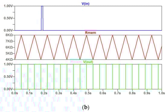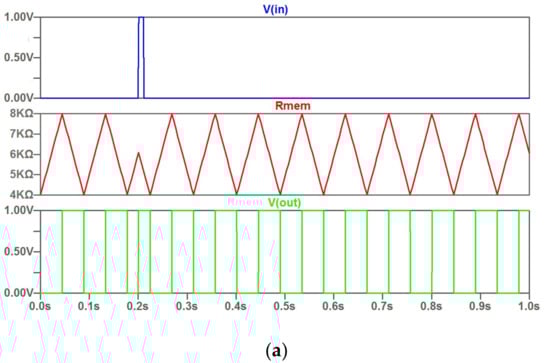 Below, reactance-less MBO with two possible types of input (Figure 1) are considered, and the comparison of two different MBO responses for different types of excitations is performed. Note that the state of the MBO during the generation of output pulse sequences in the presented simulation examples is determined by the character of the change in the memristor resistance.