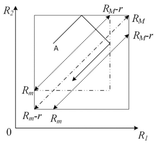 The region of states of coupled MBOs on the phase plane is the square with vertices (RM, RM) and lying on the main diagonal passing through these points. This square has the region of stationary trajectories of periodic motion of the system. The specific stationary trajectory characterizes the state of coupled MBOs. The region of stationary trajectories is bounded by straight lines that are parallel to the main diagonal. They cross a straight line perpendicular to the main diagonal and spaced from the vertex by the distance . This area is bounded by dotted lines in Figure 6. The stable trajectories themselves are straight parallel to the main diagonal. They correspond to synchronous oscillations. The trajectories on the main diagonal correspond to oscillations of MBO1 and MBO2 of equal amplitude.