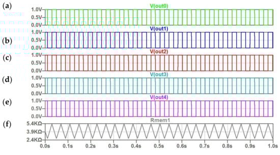 Figure 9 illustrates the response of coupled oscillators on vector Im set in accordance with “correct” image (Table 2). In this case, zero excitations fall on current inputs of oscillator circuits, since the real input signal is determined in this approach by the difference between stored and incoming signals. For this reason, we can see the same reference frequencies for all the oscillators. In Figure 9F, the triangular character of the memristor resistance change R (t) for the first oscillator is shown.