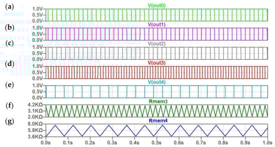 (a–g) The computed waveforms for five coupled oscillators; (f,g) the triangular character of change memristor resistances R (t) for the third and fourth oscillator.