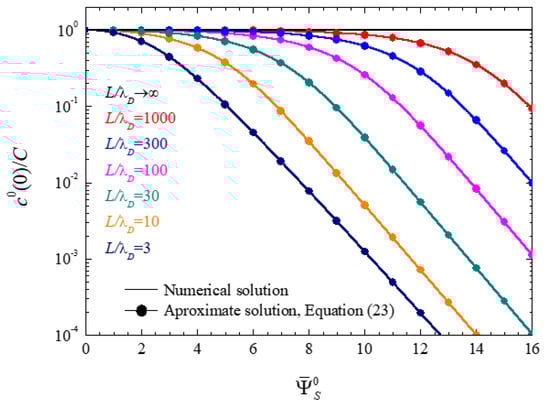 When a potential difference is applied to a closed electrolytic cell, the ions move towards the electrodes to form the double layers. This modifies the ionic concentrations at the cell center, , so that this value is lower than the initial concentration . The relative difference between these magnitudes increases when the initial concentration of ions is lowered, when the electrode spacing is lowered, or when the applied voltage is increased [28,29]. In view of approximate analytical solution (23), this quantity only depends on two parameters: the surface potential and the relation between the electrode spacing and the Debye length. These dependences are shown in Figure 1, where the quotient is represented as a function of the surface potential for different values of . This figure also includes approximate analytical results obtained using Equation (23). Note that this being a theoretical work, the dimensionless surface potentials in this and the following Figures extend to very high values. While such values of the order of 400 mV are usually unrealistic, they were used in order to better understand the qualitative behavior of the plotted magnitudes.