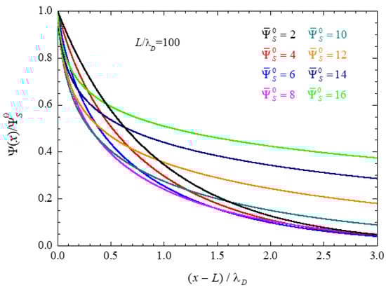 The ionic concentration decrement at the central plane of a closed electrolytic cell leads to an increment in the electric double layer thickness. Figure 2 shows numerical results of the electric potential profiles normalized to the corresponding surface potential values. It is well known [33] that, according to the PNP model used in this work, the double layer thickness decreases monotonously with the surface potential value in the case of infinite spacing. This qualitative behavior can also be observed in Figure 2 for the lowest dimensionless potentials 2, 4, and 6, but clearly not for the highest potential values.