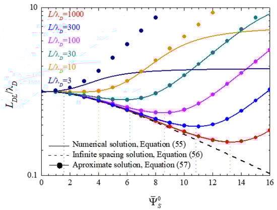 Figure 3 shows the electric double layer thickness values defined as functions of the surface potential and calculated for different values of . The solid lines correspond to numerical solutions of Equation (55), the dashed line to the infinite spacing solution, Equation (56), and the symbols to the approximate analytical solution, Equation (57). As can be seen, the solution corresponding to infinite spacing and open cells, dash line, is the only one that monotonously decreases with increasing surface potential and is independent of the parameter , Equation (56). For closed finite cells, this qualitative behavior only holds for small potential values, since for sufficiently high potentials a minimum is attained and the double layer thickness starts to increase.