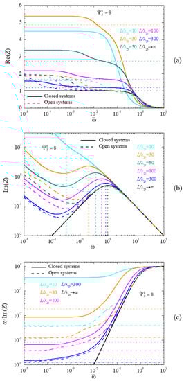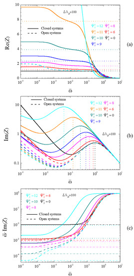 Spectra of the real part of the impedance (a), its imaginary part (b), and its imaginary part multiplied by the angular frequency (c), calculated for the indicated values and the dimensionless surface potential . Dot and dash-dot straight lines (closed and open cells, respectively) correspond to the following: (a) Real part of the impedance at frequencies between both dispersions, Equation (61) for open or (62) for closed cells; (b) characteristic frequency of the high-frequency dispersion, Equation (60) for closed cells; (c) Low-frequency limit of the imaginary part of the impedance multiplied by the frequency, Equations (63), (64), and (25) for closed or Equation (28) for open cells.