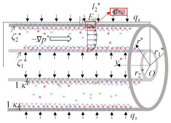 where V is the velocity vector, p* is the pressure, τ is the stress for power-law fluid, F is the body force acting on liquid, and ρ is the liquid density. Here, the flow is driven under the combined effect of electroosmotic force arising from the applied electric field, pressure gradient, and slip hydrodynamics at the walls, as sketched in Figure 1. The microannulus is characterized by the inner radius r1* and outer radius r2* in which the slip lengths near the inner and outer walls are l*1 and l*2, respectively, and the strength of the electric field is E0. To facilitate the analysis and capture the primary physics of slip flow, the following assumptions are applied: Equation (1) the thickness of EDLs at two walls is far less than ri*, and thus the EDLs will not overlap, the zeta potentials near the inner and outer walls ζi* are constant; Equation (2) in microchannels, the gravity of fluid is negligible; Equation (3) since the length of the microchannel is far longer than the characteristic radius of microannulus, the radial velocity can be ignored and only the axial velocity v* is considered; and Equation (4) the slip phenomenon is represented by Navier’s slip model [36]. Applying the assumptions above to Equations (1) and (2), one has the modified Cauchy momentum equation, the slip conditions at the channel walls, and the initial condition [36,37].