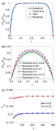 In Figure 2a, in the limiting case of a Newtonian fluid, the numerical velocity computed based on Equation (30) is compared with the analytical velocity obtained from Equation (28) and the existing data presented in the study [28] by Yavari et al. and [13] by Tsao. In Figure 2b, for power-law fluids, the numerical velocities computed from Equation (30) are compared with the existing data from [30] by Shamshiri et al. In Figure 2c, the average temperature Tm is numerically computed for different flow behavior indices n and grid numbers in terms of space J. Irrespective of the value of n, when c = 0.016 and J ≥ 151, the curve of Tm with J shows little change, meaning that J ≥ 151 is enough to obtain steady numerical solutions. To be economical, the grid number J is chosen as 201. Figure 2a,b shows when J = 201, the numerical velocities agree well with the analytical velocity or the existing data, meaning that the numerical algorithm is feasible.