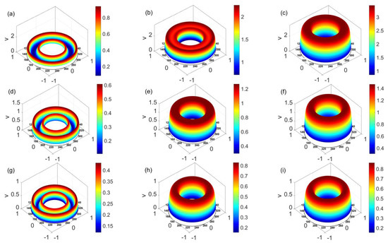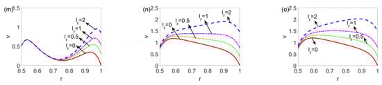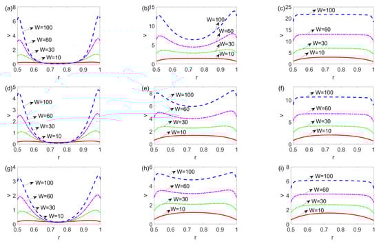 Figure 3 presents the unsteady velocity distribution over a cross-sectioned area of a microannulus at t = 0.006, t = 0.06, and t = 0.6 for the shear thinning, Newtonian, and shear thickening fluids. From Figure 3a,d,g, irrespective of the fluid type, at first the fluid at and near the channel walls is set in motion under the electroosmotic force and slippery effect, which then drags the bulk fluid in the central area forward under the shear stress and pressure gradient, forming the pressure driven electrokinetic slip flow. Figure 3a–c shows that for the shear thinning fluid, as time evolves from 0.006 to 0.6, the velocity grows obviously, and the magnitude of velocity eventually goes beyond 3. In contrast, Figure 3g–i shows that for the shear thickening fluid, from t = 0.006 to t = 0.06, the velocity distribution evolves, however, it changes little when time lapses from t = 0.06 to t = 0.6. The comparison among Figure 3a–c,d–f,g–i indicates that as time evolves, the shear thinning fluid attains the greatest velocity which is two times more than that of Newtonian and shear thickening fluids. Moreover, as time goes beyond 0.06, the change in velocity becomes smaller when the fluid changes from a shear thinning to a shear thickening fluid, meaning that the shear thickening fluid achieves the steady state earlier than the shear thinning and Newtonian fluids. In addition, since li = 0.01 (i = 1, 2), the fluid at the channel walls is not static and slips over the solid walls.