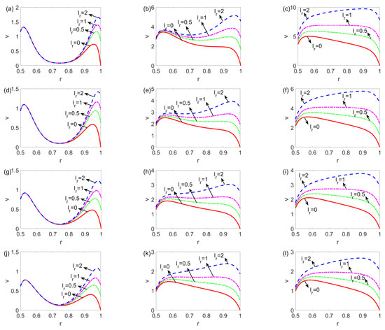 Figure 4. The variation of the velocity profile with a ratio of slip length lr at different time and flow behavior indices (a) n = 0.8, t = 0.006, (b) n = 0.8, t = 0.06, (c) n = 0.8, t = 0.6, (d) n = 0.9, t = 0.006, (e) n = 0.9, t = 0.06, (f) n = 0.9, t = 0.6, (g) n = 1, t = 0.006, (h) n = 1, t = 0.06, (i) n = 1, t = 0.6, (j) n = 1.1, t = 0.006, (k) n = 1.1, t = 0.06, (l) n = 1.1, t = 0.6, (m) n = 1.2, t = 0.006, (n) n = 1.2, t = 0.06, and (o) n = 1.2, t = 0.6, when W = 30, l1 = 0.05.