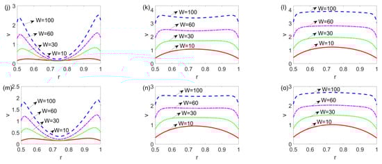 In Figure 5, the variation of the velocity profile with electrokinetic width W at a different time is presented for the shear thinning, Newtonian, and shear thickening fluids. When t = 0.006, from Figure 5a,d,g,j,m, since li ≠ 0, the fluid at and near the channel walls attains velocity first, increasing with W and decreasing with n. When the time increases to 0.06, as shown in Figure 5b,e,h,k,n, the fluid near the channel walls drives the fluid in the central area to move forward. The velocity profile of the shear thinning fluid is still developing and the shear thickening fluid flow approaches the developed state. This is especially evident with the greater value of electrokinetic width W. From Figure 5c,f,i,l,o, the velocity profile becomes steady, which shows a plug-like pattern when the electrokinetic width changes from 10 to 100 or when the fluid changes from shear thickening to shear thinning. Compared to the Newtonian and shear thickening fluids, the slip flow of a shear thinning fluid is much more sensitive to the change in electrokinetic width W.