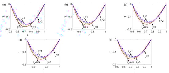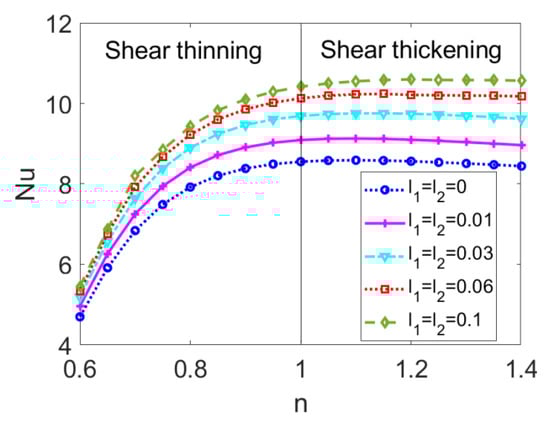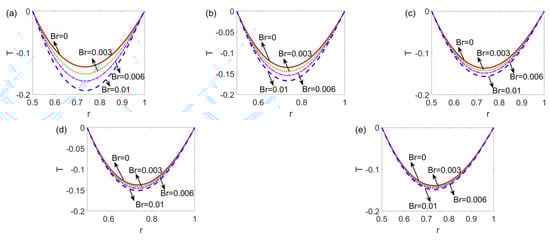 where the first term in the left-hand side (LHS) of Equation (16) denotes the heat generation caused by heat diffusion, and the remaining terms in LHS denote the heat generations arising from axial conduction, Joule heating, and viscous dissipation, respectively. To note, S is the Joule heating parameter and Br is the Brinkman number, representing the viscous dissipation effect. To provide an in-depth insight into the heat transfer performance of electrokinetic slip flow, the first law analysis is conducted, i.e., the Nusselt number implying the heat transfer efficiency is deduced [26,38]. According to Nu = 2qs(r*2r*1)/(T*wT*m)/k and the mean temperature