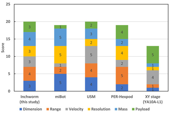 Comparison of typical micromanipulation robots and XY stage [22,24,27]. Scores are evaluated based on the reference [27] (refer to Table S1 of the Supplementary Materials for the quantitative comparison of the performances).