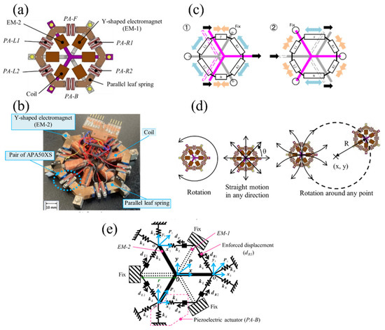 Figure 2a shows the structure of the holonomic inchworm robot. EM-1 and EM-2 are pairs of Y-shaped electromagnets (EMs) that are separated to avoid mutual attraction. These EMs form a closed loop via a ferromagnetic surface to obtain a sufficient magnetic force to fix the floor. PA-F, PA-B, PA-L1, PA-L2, PA-R1, and PA-R2 are piezoelectric actuators (PAs) with a mechanical displacement amplification mechanism. We arranged EM-1 and EM-2 to cross each other and connect them to the six PAs to move precisely in all directions according to the inchworm principle.