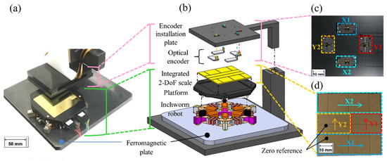 XYθ position sensor: (a) magnified view of the measurement area; (b) assembly drawing; (c) encoder installation plate; (d) integrated 2-DoF scale.