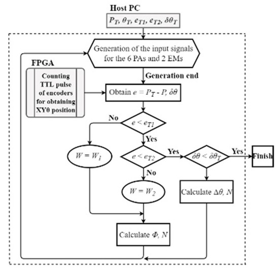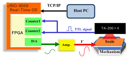 As shown in Figure 4, we used a field-programmable gate array (FPGA) (C-RIO-9049, NI, TX, USA) to generate the control voltages of the robot and convert the transistor-transistor logic (TTL) signals from the encoders to XYθ displacements. The control voltages were magnified by 30 times using an amplifier circuit. The magnified signals are the input voltages to the PAs (V), as shown in Equation (9). The minimum measurement cycle of the FPGA was 0.35 μs, and the maximum calculated speed was 2800 mm/s. The FPGA measured the displacement of a sinusoidal vibration up to 1273 Hz with a displacement amplitude of 30 µm.