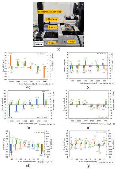 Figure 6a shows the experimental setup. We replaced the robot with an XYθ stage, as shown in Figure 3. We fixed the encoder installation plate above the XYθ stage to measure the XYθ displacements from a stationary coordinate system. We placed the 2-DoF scale as the measurement target at the top of the θ stage.