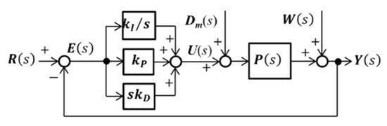 Figure 9 shows a block diagram of the PID control. We define dm(t) and w(t) as vectors composed of the modeling error and uncertainties of the measured displacement, respectively. Here, kI, kP, and kD are vectors composed of integral, proportional, and derivative gains along the x-, y-, and θ-axes, respectively; r(t) is the target position, and e(t) is the deviation between r(t) and y(t). We applied a first-order Butterworth filter with a cutoff filter of 50 Hz to E(s) before derivative (D) control to minimize the time delay of the primary experiments.