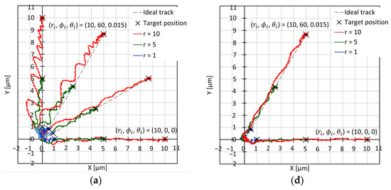 In the experiments, we adjusted kI, kP, and kD for each experimental condition by using a heuristic method to obtain a no-overshoot trajectory. We conducted experiments five times for each condition, and similar results were obtained. We determined the target travel lengths ri as 1, 5, and 10 μm and the target moving directions φi as 0°, 30°, 60°, and 90° for translational movements. We also determined the target rotational displacement of θi as 0 and 14.8 millidegrees in the θ-axis. In addition, we determined the thresholds of the X-, Y-, and θ-axes as XT = ±0.14 μm, YT = ±0.14 μm, and θT = ±0.4 millidegrees around their corresponding targets.