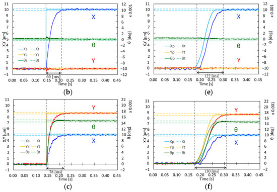 Figure 10d–f shows the experimental results for the parabolic-shaped references with a rise time of 100 ms. Similarly, we define the parabolic-shaped target of the X-axis as XP, YP, and θP. Figure 10d shows the XY trajectories. Figure 10e,f shows plots of X, XP, Y, YP, θ, and θP vs. time for the 0° and 60° directions, and their settling times were approximately 122 and 130 ms, respectively. The oscillations decreased to ±0.5 μm in the X and Y axes, as shown in Figure 10.