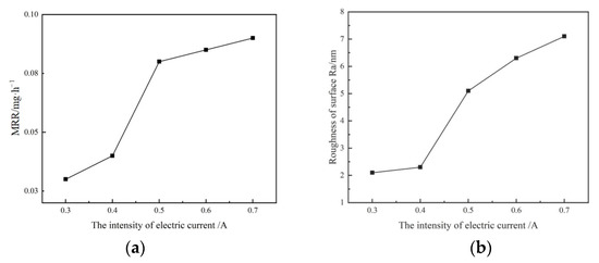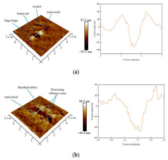 - Cavitation does not occur in the focusing center of the ultrasonic field under a small current, and material removal is caused by the impact of abrasive particles on the workpiece surface driven by ultrasonic vibration. In this case, plastic material removal at the nanometer level can be achieved. With the increase of drive current, cavitation occurs and material removal is the collaborative removal caused by abrasive impacts on the workpiece surface under the excitation of ultrasonic vibration, ultrasonic cavitation jets directly acting on the workpiece surface, and abrasives impacting on the workpiece surface under the action of cavitation jet.