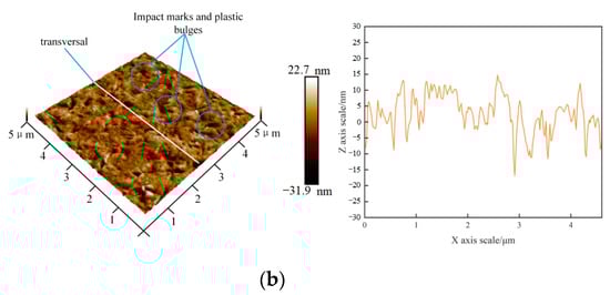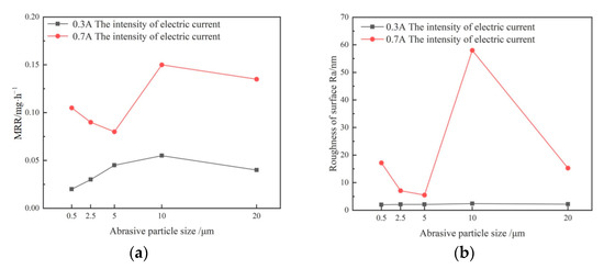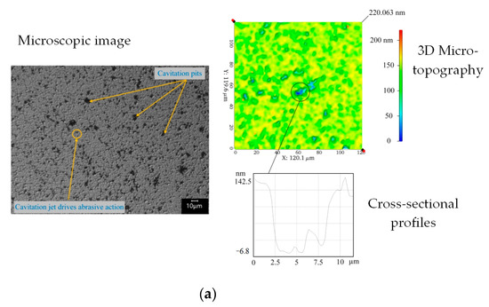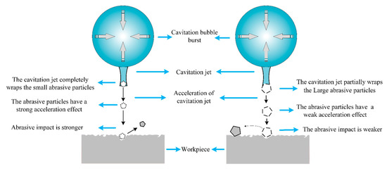 - The material removal rate fluctuated with the change in the abrasive particle size. The abrasive particle size affects the intensity of the direct cavitation on the workpiece surface. A large abrasive size is more conducive to heterogeneous cavitation nucleation and has a stronger inhibitory effect on direct cavitation on the workpiece surface. More cavitation occurs at the position of abrasive particles, and the material removal resulting from abrasive particles impacting the workpiece surface under the action of the cavitation jet is enhanced. Moreover, the abrasive particle size affects the driving effect of the cavitation jet on the abrasive particles. Abrasive particles with smaller sizes are completely wrapped by the cavitation jet, which realized a stronger driving effect. However, abrasive particles with a larger size is partially wrapped by the cavitation jet, which became obstacles between the cavitation jet and workpiece surface.