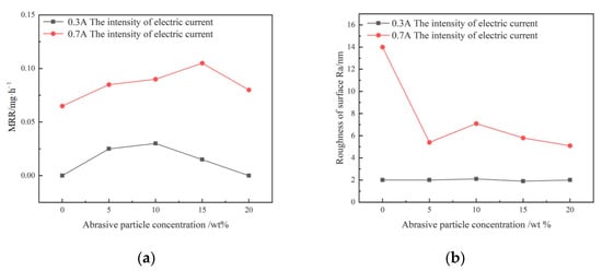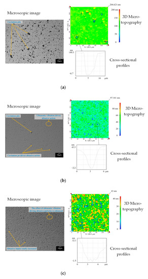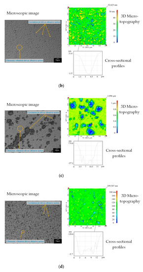 - The material removal rate increased firstly and then decreased with the increase of abrasive concentration. The heterogeneous cavitation–nucleation phenomenon generated by the addition of abrasive particles inhibited the intensity of direct cavitation action on the workpiece surface. The abrasive particle concentration affects the abrasive impact density, and material removal resulting from the ultrasonic cavitation jet directly acting on the workpiece surface is weakened.