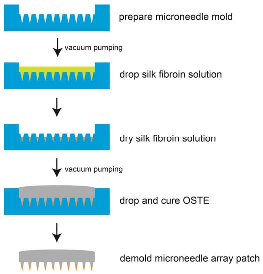 Hypodermic needle-based injection, as one of the most widely used methods for drug delivery in the world, guarantees the effective delivery of drugs but comes with the problems of invasiveness, requiring professional administering skills, and generating sharp waste. Transdermal drug delivery overcomes the drawbacks of hypodermic needle-based drug delivery and is advantageous for site-specific and controlled drug delivery. As a result of the need of the successful delivery of larger molecules across skin, the hybrid between these two conventional delivery methods is under development []. A microneedle is a sharp needle on a micrometer scale that can penetrate the epidermis of the skin, reach the dermis, and release drugs in a painless and minimally invasive way. To ensure the rigidity of the microneedles, metal and silicon have been used to fabricate microneedle array patches [,]. However, they are expensive and increase the burden of disposing of biohazardous waste. Some synthetic polymers are being developed to replace them, such as polylactic-co-glycolic acid (PLGA), poly-L-lactide (PLA), and polyvinyl alcohol (PVA) [,]. However, the high temperature needed for melting such materials may lead to the ineffectiveness of the carried drugs such as insulin. Silk fibroin is a natural biomaterial from Bombyx mori. It has been proven to be suitable as a drug carrier used in microneedles because of its advantageous features. When it dissolves in our skin, it is not harmful or toxic and will not generate any inflammatory degradation products []. Furthermore, it can help improve the mechanical strength of microneedles due to its high structural rigidity []. Remarkably, the drug activity can last for a long time when using fibroin protein as a carrier [,]. Apart from these, its high-water solubility can guarantee the complete dissolution of drugs without the need for high temperatures or other solvents, and rapid dissolution once inserted into the skin. Furthermore, it is widely available and cheap []. Recently, more studies used silk fibroin as a microneedle matrix, but pure silk fibroin microneedles or silk fibroin base may lead to burst release of drugs, which still causes problems of drug build-up [,]. Moreover, pure silk fibroin microneedle array patches may waste drugs since only the microneedle tips penetrating the skin can release drugs. The drugs left in the flat base or the microneedle bottoms may not be absorbed by the skin. In addition, present methods of fabricating silk fibroin microneedles need a lot of complex operations, including water vapor annealing, lyophilization, and centrifugation [,,]. Off-stoichiometry thiol-ene (OSTE) is a novel polymer which is photocurable and enables rapid prototyping of microstructures []. Its tunable mechanical properties may help to form a microneedle array patch with suitable rigidity that not only can penetrate into skin but also conformably wrap around the skin surface by adjusting the off-stoichiometric ratio alone. Based on the working mechanism of drug delivery, microneedles are categorized into five types, including solid, coated, hollow, dissolving, and hydrogel-forming microneedles []. Among them, dissolving microneedles have some significant advantages in biodegradable components, ease of manufacturing, and one-step application []. In this study, we develop a protocol for facile fabrication of microneedles consisting of silk fibroin tips and an OSTE base to ensure mechanical strength and simplify the fabrication procedures. We deposit the silk fibroin solution with dummy drugs (insulin in this work) on the microneedle mold to form the tips and cure OSTE on them to form the base, which only needs the conditions of room temperature and normal ambient light. The microneedle array patches fabricated by this method are expected to make the whole silk fibroin tip penetrate into the dermis and improve the delivery efficiency of drugs. More importantly, the protocol is suitable for large-scale manufacturing and may find immediate applications in the market of microneedles for drug delivery.