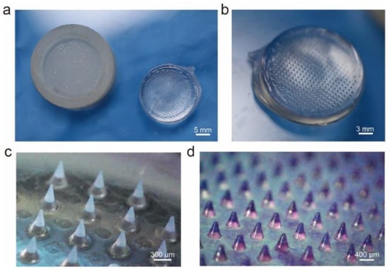 When OSTE is fully cured, it is easy to demold the microneedle array patch; the microneedle mold and microneedle array patch after demolding are shown in Figure 2a. We can see that a homogeneous microneedle array is formed, as shown in Figure 2b. The slender and tapered microneedles consist of two parts: needle tips in white color and a transparent OSTE base, as shown in Figure 2c. The microneedle array exhibits the microneedles with a height of 500 μm and a diameter of 270 μm at the bottom, and the distance between the two needle tips is 700 μm. We can see that the uniform microstructure is fabricated without any observable change. To better visualize the silk tip, we added some purple food dye to the silk fibroin, and we can see from Figure 2d that the needle tips made of silk fibroin are obviously formed on the transparent OSTE base. We also used SEM to observe the microstructure of the microneedles (shown in Appendix A).