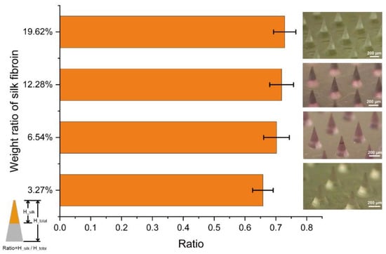 To investigate the influence of the weight ratio of silk fibroin on the height of needle tips, we changed the weight ratio of silk fibroin from 3.27% to 19.62% and analyzed the ratio of the height of the silk fibroin tips to the height of the whole microneedles using ImageJ (http://rsb.info.nih.gov/ij/; accessed on 2 January 2022). We used a stereomicroscope to acquire the pictures of the microneedle array, where we kept placing the patches at 45° to the ground to maintain the consistency of analyses. We find that there is a very small difference between the ratio of the microneedles with different weight ratios of silk fibroin (shown in Figure 3), where the average ratio of tip and base is about 0.66, 0.70, 0.72, and 0.73, respectively. We suspect that silk tips formed with different silk fibroin concentrations may have different inner structures, such as more pores at low silk fibroin concentrations. However, more investigation is needed to be clear about the reason behind this.