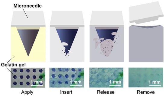 The process of application, insertion, release, and removal of microneedles. The pictures at the top show the schematic of the change of the tip. The pictures at the bottom show the change on the gelatin gel after inserting microneedles.