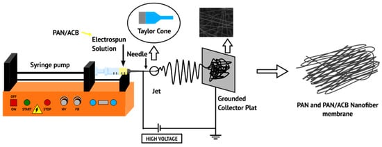 2.1. Synthesis of PAN Membranes and PAN/ACB Nanofiber Composite