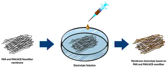 The nanofiber PAN and PAN/ACB membranes were dripped with a liquid electrolyte (mosalyte, TDE-250) until the nanofiber membrane had absorbed the electrolyte solution. Once cleaned, the solution that was left on the membrane surface and electrolyte membrane were obtained. Figure 2 shows a schematic of the electrolytic membrane preparation process based on PAN and PAN/ACB nanofiber membranes.