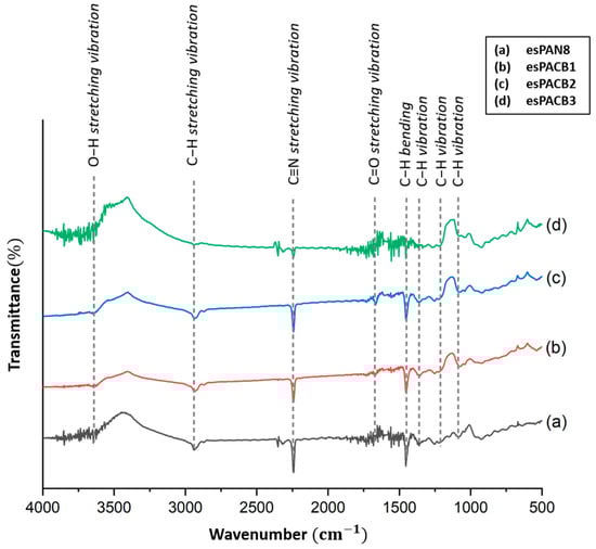 The functional groups of the PAN and PAN/ACB nanofiber membrane composites were characterized using the FTIR spectrum. Figure 3 illustrates the wavenumber range of the IR spectrum, which ranges from 4000–500 cm−1.