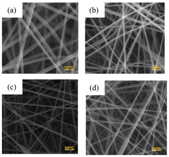 The surface morphology and diameter of PAN membranes and PAN/ACB nanofiber composites were characterized using Scanning Electron Microscopy (SEM). Figure 4 is a SEM image of the PAN membrane and the PAN/ACB composite, which was observed at a magnification of 50,000 times. Figure 4a shows the result of an SEM image of a pure PAN nanofiber membrane synthesized with a PAN concentration of 8 wt%. The PAN nanofibers illustrate that the obtained fiber was smooth and uniform without beads. Meanwhile, the morphology of the PAN/ACB nanofiber composite membrane is shown in Figure 4b–d.
