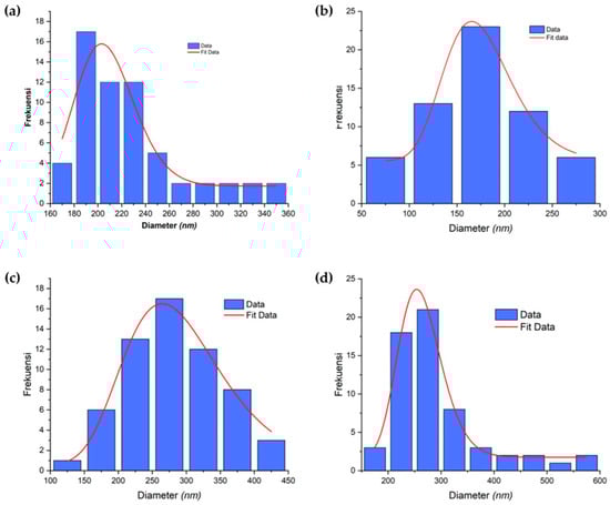 The resulting fiber contains beads at several fiber points due to the addition of filler in the form of ACB with different masses, which causes a decrease in viscosity and an increase in conductivity []. Fiber diameter was obtained from SEM images and manually analyzed using ImageJ software. Based on Figure 4a, the diameter distribution shows that the average fiber diameter on the PAN nanofiber membrane is 206.1 ± 3.9 nm. Meanwhile, Figure 4b–d show that the average diameter of PAN membrane fibers that have been added with ACB nanoparticles varies, as shown in Table 5. Figure 7 shows the distribution of fiber diameters in a histogram.