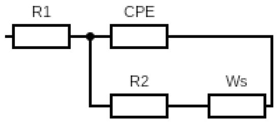 Furthermore, the photo-electrochemical processes, including the ionic processes (diffusion and recombination) that occur in DSSC, have been investigated through EIS characterization. All DSSC Nyquist plots show almost the same semicircle spectrum, forming two semi-circles. This graph is then fitted using an EIS analyzer with a modified Randels–Ershler cell series, as shown in Figure 8. R1, R2, and Ws are ohmic resistance, charge transfer resistance, and Warburg impedance with finite length. R1 is known as series resistance. Its value decreases with each variation, causing the spectrum to shift to the left. This series resistance is associated with the diffusion of TiO2 shown in the first semicircle. Next is R2, where the resistance value is related to the diffusion of electrons and is shown in the second semi-circle where each variation looks bigger. Furthermore, this value can be used to determine ionic conductivity through Equation (2).