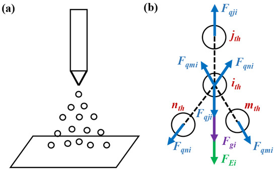 Force analysis on electrospray droplets: (a) schematic diagram of spatial distribution of electrospray droplets; (b) force analysis on the ith droplet. FEi: the electric field force on the ith droplet; Fqji, Fqmi, and Fqni: the charge repulsive force of the jth, mth, and nth charged droplets to the ith charged droplet, respectively; Fg: the gravity of the ith charged droplet.