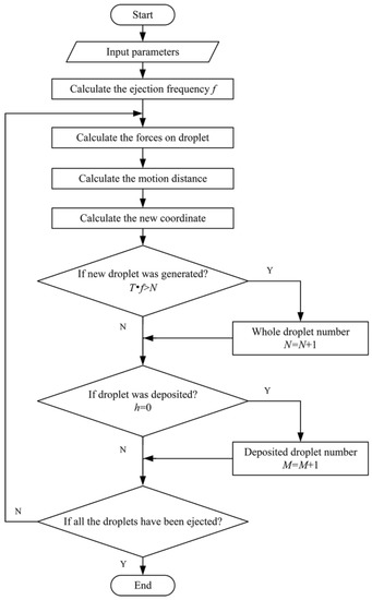 Then, a simulation program based on the Four Bands Runge–Kutta method was built to simulate the spatial distribution of electrospray droplets through the Matlab software (MATLAB R2022b, MathWorks, Natick, MA, USA). The flow chart of the simulation program is presented in Figure 2.