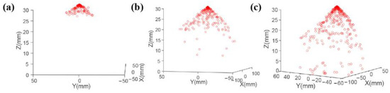 The motion behavior of the electrospray droplets was simulated, as shown in Figure 3. The droplets were ejected from the nozzle one by one according to the ejection frequency, then distributed in an “umbrella” shape in the space between the nozzle and the collecting plate. At the nozzle outlet, the motion velocity of the electrospray droplet was small, and the distribution density was high, while as the distance from the nozzle outlet increased, the motion velocity of the electrospray droplet increased, and the distance between the charged droplets increased, leading to the decrease in the distribution density and the increase in the distribution range of the electrospray droplets.