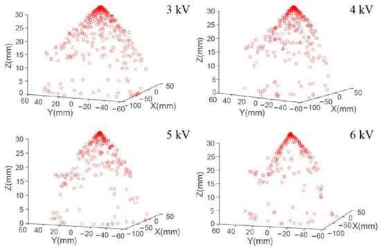 As the electrical field strength increased proportionally with the applied voltage, the effect of electric field force on the droplet motion behavior was increased by accelerating the velocity of droplets. As shown in Figure 5, when the applied voltage was low, the motion velocity of the droplet ejected from the nozzle was small, leading to a high distribution density of droplets at the nozzle outlet and more motion droplets in the space. Thus, the distribution area of electrospray droplets increased as the charge repulsive force played the dominant effect. When the applied voltage was high, the droplets moved under a large motion velocity to the collecting plate after being ejected from the nozzle, and the influence of charge repulsive force was decreased as the electric field force acted with a dominant effect. In this way, the distribution density and deposition area decreased with the applied voltage.