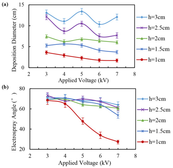 Distribution characteristics of charged droplets under different applied voltages and distances from the nozzle to the collecting plate (h): (a) deposition diameter; (b) electrospray angle.