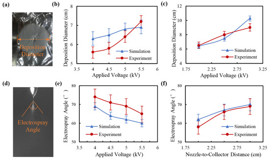 Electrospray experiments were conducted to verify the effectiveness of the simulation model, as presented in Figure 7. The deposition membrane is shown in Figure 7a and the electrospray jet is captured as Figure 7d. After being ejected from the nozzle, the electrospray droplets were distributed in an “umbrella” shape and deposited into a round membrane, as shown in the simulation results in Figure 4 and Figure 5. The deposition diameters and electrospray angles under different applied voltages and distances from the nozzle to the collecting plate were also investigated, as depicted in Figure 7b,c,e,f. The variation trends of the experimental results were like that of the simulation results, indicating that the numerical simulation method could guide the experimental process of electrospray. However, the electrospray droplets were modeled as charged rigid particles moving in the electric field, ignoring their fluidity (including the oscillation, the deformation, and the break-up process). Thus, the simulation approach could not fit the experiment results well.