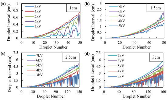 The effect of applied voltage on droplet interval under different distances from the nozzle to the collecting plate was simulated as Figure 8. It could be seen that the droplet interval increased with the ejection distance in a quadratic function relationship. When the distance from the nozzle to the collecting plate was 1 cm, the electric field force played the main role on the motion behavior of droplets rather than the charge repulsive force due to the short motion distance. Thus, the droplet interval decreased with the applied voltage, as depicted in Figure 8a. However, with the increase in the distance from the nozzle to the collecting plate, the motion velocity was decreased, and the effect of charge repulsive force was enhanced. As such, when the distance from the nozzle to the collecting plate was longer than 2 cm, the droplet interval increased with the applied voltage, as shown in Figure 8c,d.