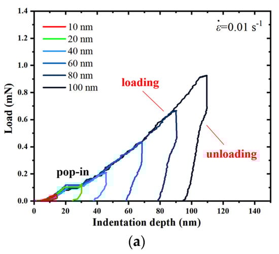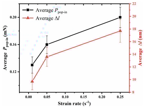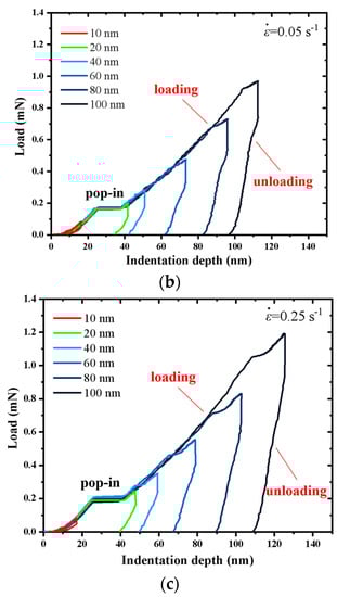 According to Equation (6), the yield stress showed an increasing trend with the strain rat, so the corresponding pop-in load also increased with the increasing strain rate. The pop-in is a thermally activated event under loading. The lower strain rate leads to the increased time at load, which makes it easier for the critical thermal fluctuation to occur [48]. Therefore, the lower strain rate induced a lower pop-in load (corresponding to a smaller pop-in depth).