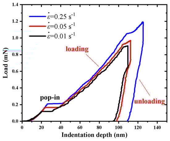 Comparison of the load–indentation depth curves at the indentation depth of 100 nm under three different strain rates.