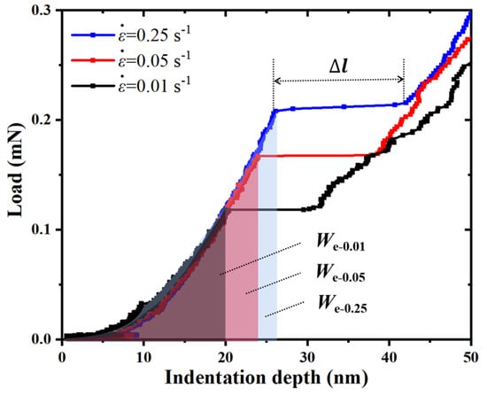 As shown in Figure 3, the elastic-strain energy, We, which is equal to the area under the elastic-loading curves also increased with the increasing strain rate (We-0.01 < We-0.05 < We-0.25). According to the overall energy balance, the higher elastic-strain energy, We, at the higher strain rate corresponds to the greater number of generated dislocation loops, N. The relation between the number of generated dislocation loops, N, and pop-in extension width, , can be expressed as follows [49]: