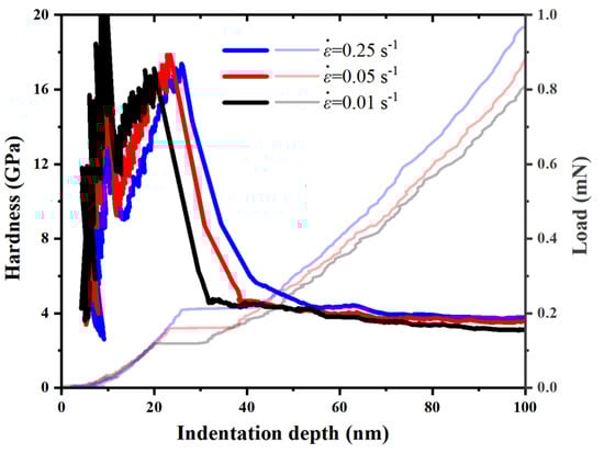 Figure 5 shows the typical hardness–indentation-depth curves and the corresponding load-indentation-depth curves of an a-plane () ZnO single crystal at the maximum indentation depth of 100 nm, under the strain rates of 0.01 s−1, 0.05 s−1, and 0.25 s−1. It can be seen that the curves exhibited some fluctuations when the indentation depth was less than about 10 nm. This could be related to the resolution of the indenter, the smoothness of the specimen surface and the environmental noise for determining the initial contact position during the nanoindentation test [50]. When the indentation depth was more than 10 nm, the hardness at each strain rate increased rapidly and reached its peak at the onset of pop-in. Before the pop-in, the plastic deformation did not start, and the shear stress beneath the indenter increased with the increasing indentation depth, leading to the increased hardness [51]. During the pop-in, the hardness at each strain rate dropped quickly, which resulted from the dislocation nucleation and its avalanche-like multiplication [30,49]. The hardness decreased slowly after the pop-in, and then tended to be stable when the indentation depth was more than 80 nm. Generally, the phenomenon that the hardness decreases with the increasing indentation depth is known as normal indentation-size effect (ISE). Conversely, the phenomenon that the hardness increases with the increasing indentation depth is known as reverse ISE [52]. Therefore, the hardness of an a-plane () ZnO single crystal showed reverse ISE before the pop-in, and exhibited normal ISE after the pop-in.