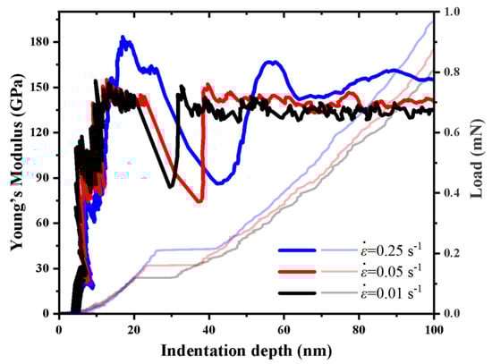 The Young’s modulus–indentation depth curves for the a-plane () ZnO single crystal at the indentation depth of 100 nm, under three different strain rates (The corresponding load–indentation depth curves are also displayed).
