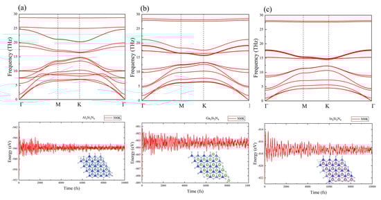 The phonon spectra and energy variations under the AIMD simulations at 300 K of (a) AlSiN, (b) GaSiN and (c) InSiN.