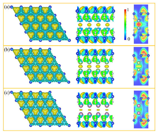 The top and side views of the deformation electron density and electron localization function (ELF) map sliced perpendicularly to (110) direction for (a) AlSiN, (b) GaSiN and (c) InSiN. The isovalue is set to be 0.01 e/Bohr. The deformation electron density is defined as the MSiN monolayer total charge density, subtracting the sum of isolated atoms. The charge accumulation and depletion regions are shown in yellow and blue, respectively.